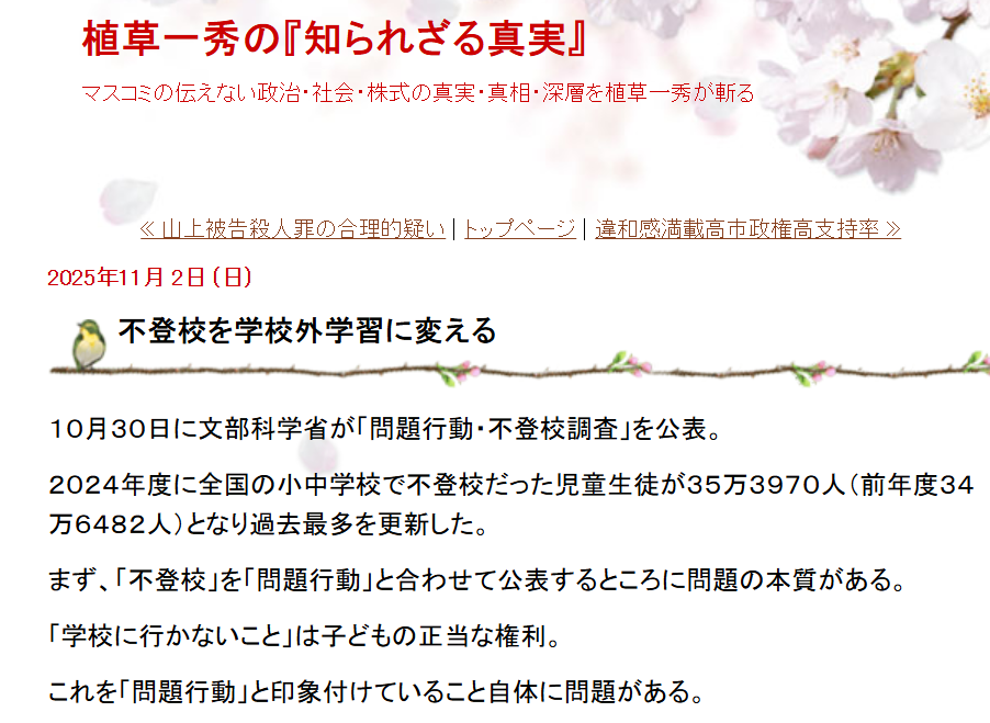 「植草一秀さんの秀逸ブログをご案内~不登校ではなく、学校外学習だ~」