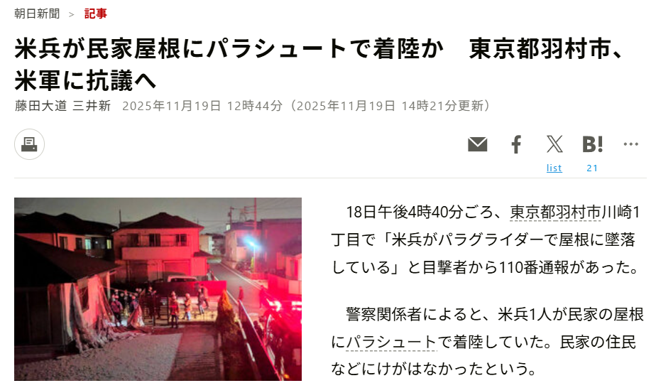 • 「私が暮らす羽村市にて、パラシュート訓練米兵が民家の屋根に落下。」